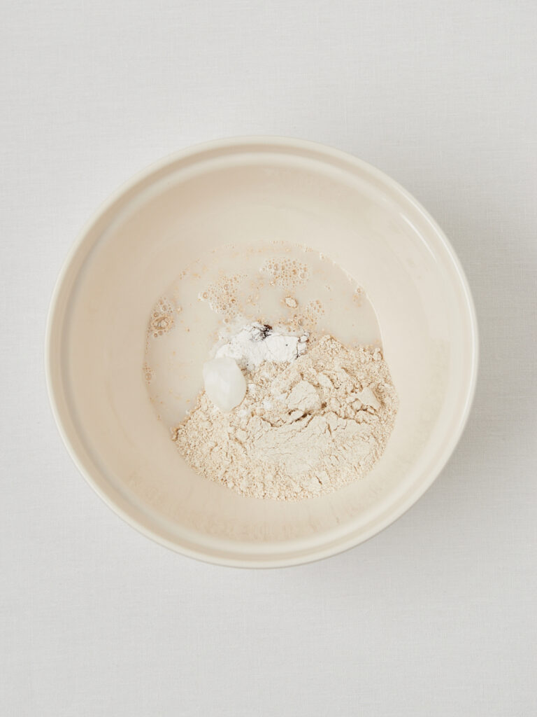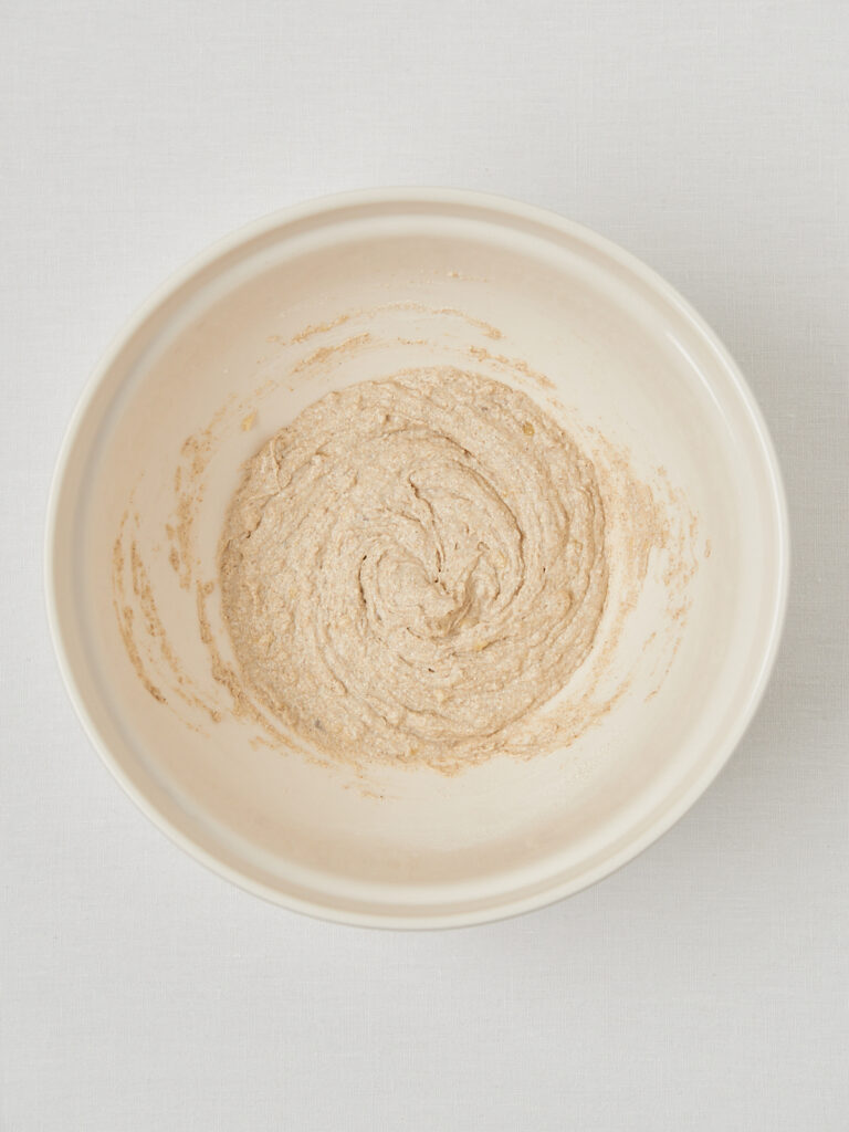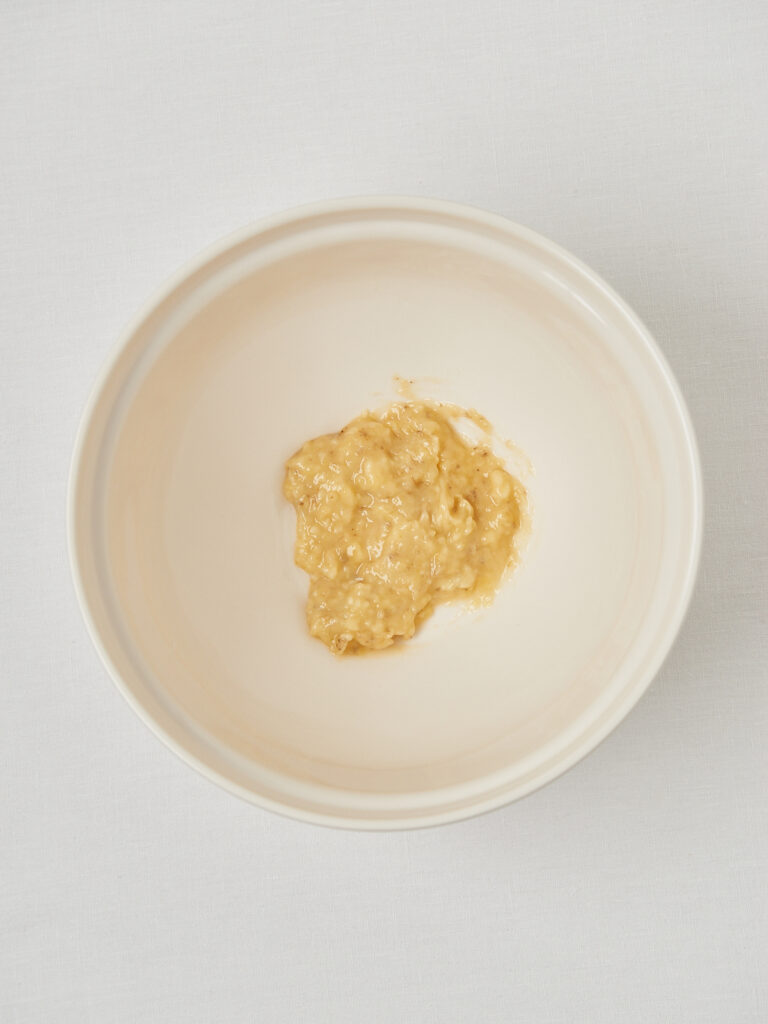 - Teig vorbereiten: Banane zerdrücken, mit Pflanzenmilch, Hafermehl und Backpulver vermengen. Kokosöl einrühren.