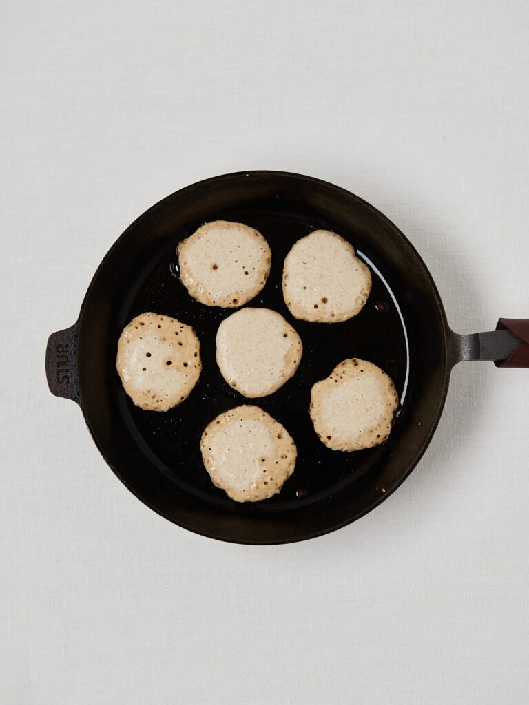 - Pancakes braten: Teig portionsweise in die Pfanne geben, 1–2 Minuten pro Seite braten, bis sie goldbraun sind.
