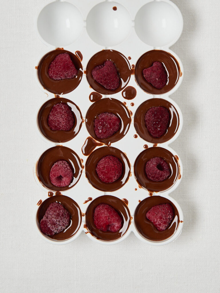 3. Himbeeren platzieren: 1–2 gefrorene Himbeeren in jede Form geben.